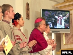 За гадзіну да тэлеўключэньня з залі Паўла VІ у Ватыкане, мітрапаліт Тадэвуш Кандрусевіч прывітаў сотні чалавек, якія сабраліся ў менскім касьцёле Панны Марыі, а таксама дзесяткі дэлегацый з розных рэгіёнаў Беларусі: