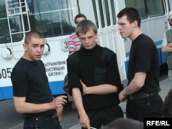На пляцоўцы стаялі “аўтазак” і аўтобус са спэцназаўцамі. Некалькі маладых людзей, апранутых у чорныя майкі і штаны, запраўленымі ў боты, хадзілі вакол натоўпу. Журналісты заўважылі, што яны некалькі разоў падыходзілі і садзіліся ў аўтамабіль “Жыгулі”, за рулём якога знаходзіўся міліцыянт.