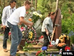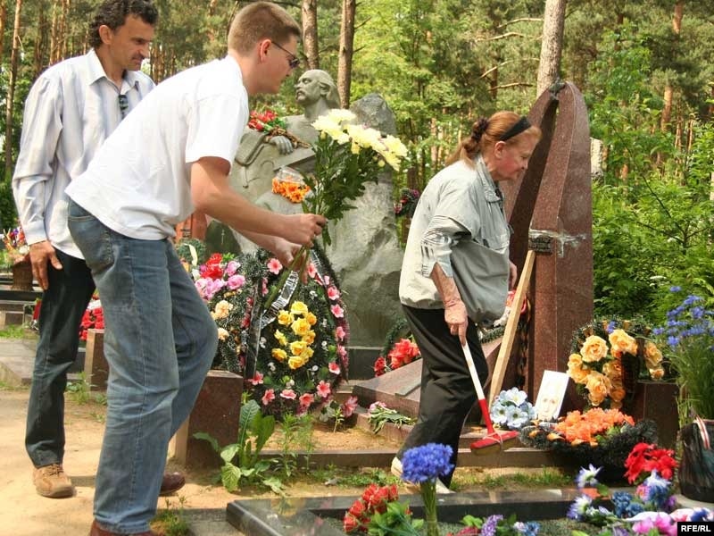 Сяргей Сыс, пісьменьнік, ускладае кветкі на магілу Васіля Быкава
