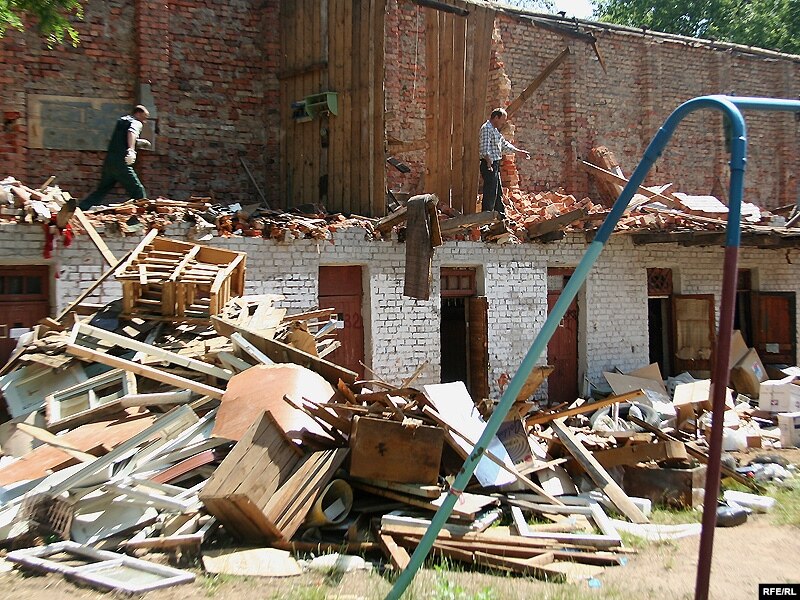 У двары дома нумар 9 па вуліцы Захарава ў Менску (раён плошчы Перамогі) па рашэньні мясцовых уладаў будаўнікі зносяць гаспадарчы будынак, у якім грамадзяне трымаюць свае рэчы.