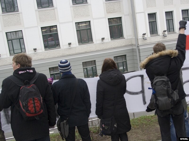 11:10 Моладзь, салідарная з Аляксандрам Баразенкам, пачала пікет каля будынка суду. Яны разгарнулі расьцяжку "Свабоду Баразенкі" і скандуюць "Уладу - народу, моладзі - свабоду!"