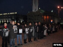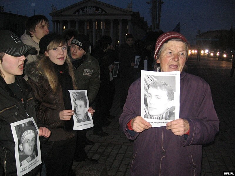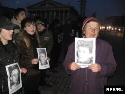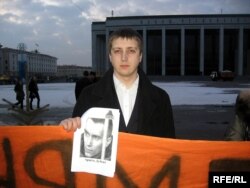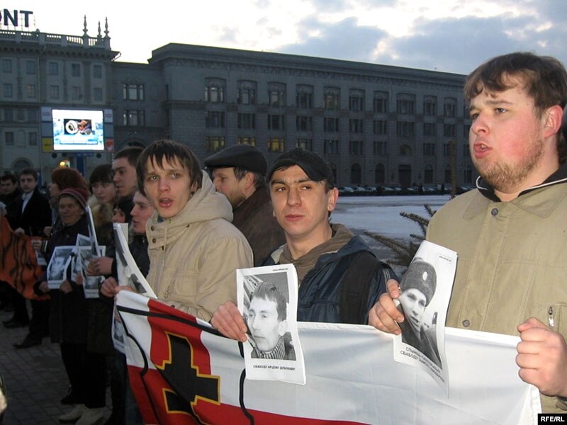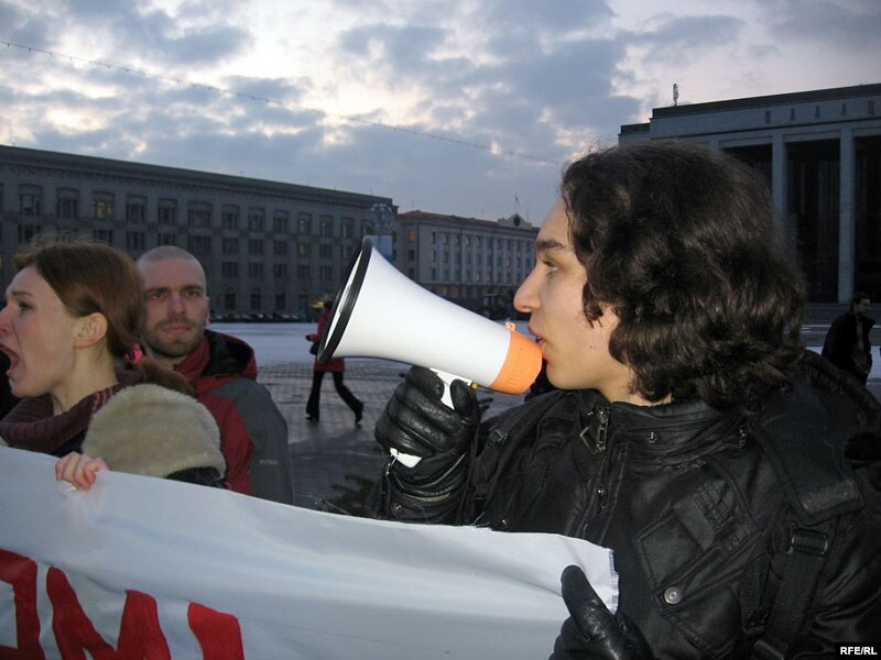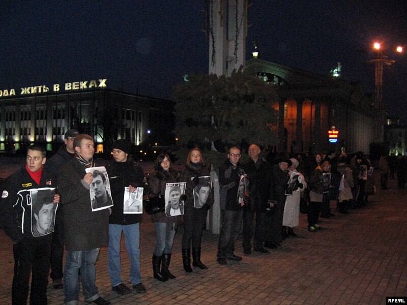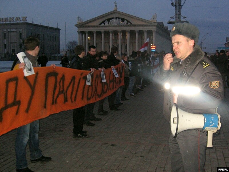Лунёва: Больш за 150 актывістаў моладзевых арганізацый «Маладая Беларусь», «Джынс за свабоду» і «Малады фронт» ладзяць акцыю на знак салідарнасьці зь Мікалаем Аўтуховічам, Юрыям Лявонавым, Уладзімерам Асіпенкам і Арцёмам Дубскім. Маладыя людзі трымаюць партрэты, і зьвяртаюць увагу, што пад пагрозай зьняволеньня застаюцца пакараныя па так званыя справы 14-ці. Супрацоўнікі міліцыі назіраюць за гэтай акцыяй, тут таксама байцы спэцназу. Ніякага загаду разганяць акцыю не было. Сярод палітыкаў я бачу лідэра ПБНФ Лявона Баршчэўскага. Маладыя людзі скандуюць «Свабоду палітвязьням!».