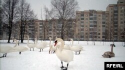 Птушак кормяць людзі. І для многіх гэта не толькі забаўка, бо лёд на возеры адступіў толькі трошкі ад берагоў. Птушкам бракуе ежы й вады.