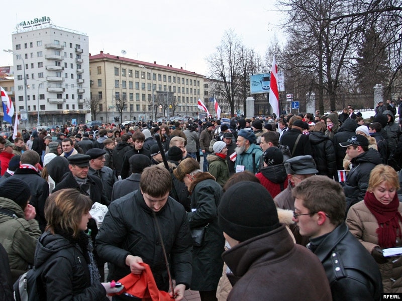18:02 На пляцоўцы каля Акадэміі навук более народу – ужо каля тысячы чалавек. Моладзь скандуе "Жыве Беларусь!" У грамадзе заўважаныя міліцыянты ў цывільным, у тым ліку высокапастаўленыя супрацоўнікі менскай міліцыі й Міністэрства ўнутраных спраў.