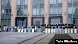 Гэтыя будынкі ўчора былі захопленыя і разрабаваныя дэманстрантамі, якія пратэставалі супраць абвешчанай перамогі на парлямэнцкіх выбарах кіроўнай Камуністычнай партыі Малдовы.