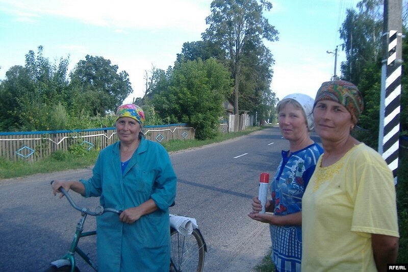 1 кабета: “Жывем вось так. Гаруем на гародах. Што маем сваё. А ў магазын схадзіць — мы мала што купляем. Няма за што. А Лукашэнка ўсё езьдзіць да нас. Усё цудоўна. Радыяцыі няма. Зона чыстая”.