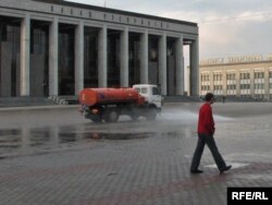 17:50 Перад пачаткам заплянаванай на 18-ю гадзіну акцыі па Кастрычніцкай плошчы езьдзіць вадавоз і палівае яе вадой. Плошча ўся залітая, але вадавоз працы не спыняе.