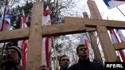 “Па нашай замове прывезьлі гэтыя крыжы. Вось гэтыя сябры нашай партыі зрабілі. Некаторыя крыжы самі прынесьлі людзі”.