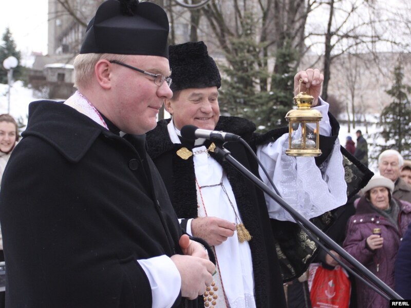 Лямпаду з Бэтлеемскім агнём, які дагэтуль гарэў толькі ў катэдральным саборы, прымае пробашч касьцёлу сьвятых Сымона і Алены Ўладзіслаў Завальнюк (справа).