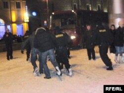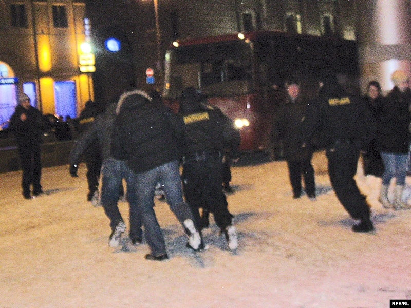Спецназаўцы на плошчы затрымалі 7 чалавек, іх завялі ў аўтобус, і як толькі гэты аўтобус зьехаў – а там знаходзіліся лідэр Маладой Беларусі Артур Фінькевіч, лідэр кампаніі "Эўрапейская Беларусь" Яўген Афнагель, карэспандэнтка “Нашай Нівы” Юлія Дарашкевіч, якую абвінавацілі ў тым, што яна нібыта зьбіла міліцыянта – некалькі моладзевых актывістаў разгарнулі бел-чырвона-белы сьцяг, сталі ланцугом на плошчы, пачалі скандаваць: "Жыве Беларусь!" Іх адразу схапілі спецназаўцы, пачалі цягнуць па сьнезе за ногі, за рукі – у другі аўтобус трапілі 6 чалавек. Іх таксама павезьлі ў міліцыю Цэнтральнага раёну Менску.