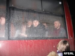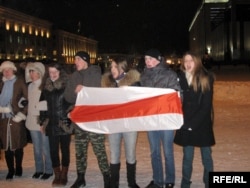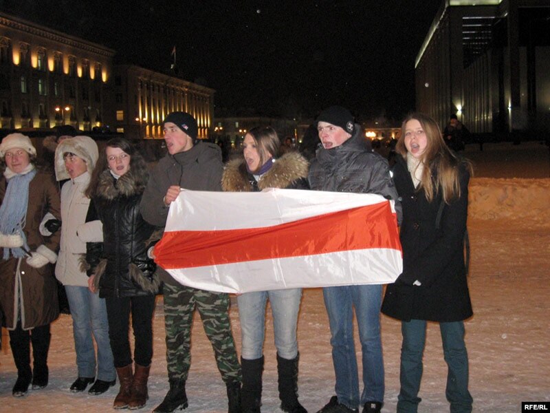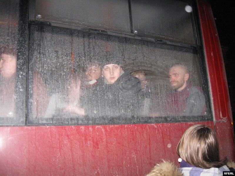 Як толькі аўтобус ад’ехаў ад плошчы, некалькі чалавек сталі зь бел-чырвона-белым сьцягам. Яны толькі некалькі разоў пасьпелі праскандаваць: «Свабоду!», «Жыве Беларусь!», як іх пацягнулі ў другі аўтобус.