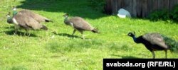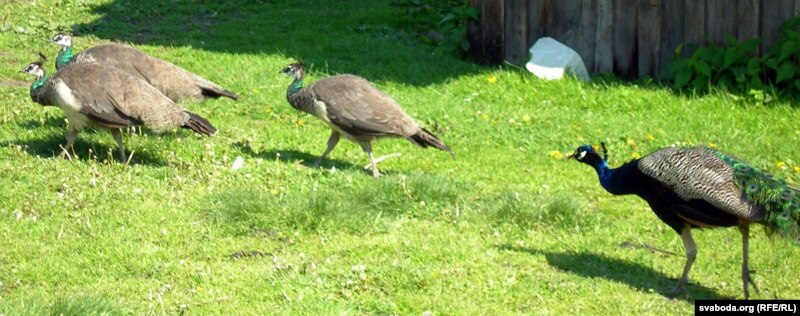 «Ну ходзяць, як бачыце. Але першы раз вельмі ўважліва глядзяць, таму могуць і чалавека папужаць. Пеўня ганяюць рэгулярна. То бок паўліны куды больш актыўныя ў гэтым сэнсе, самі правакуюць сутычкі. Прычым, што дзіўна, яны ж б’юцца ня дзюбай, а нагамі. Падскокваюць і нагамі пачынаюць лупіць. Мабыць нешта ад стравусаў таксама ў іх ёсьць, бо байцы адчайныя.