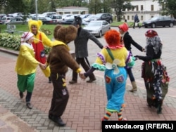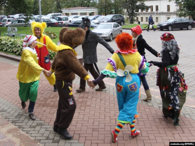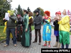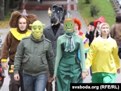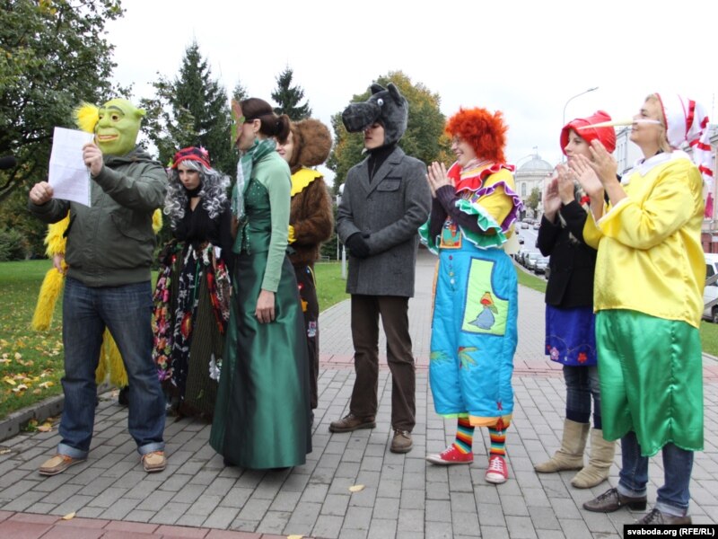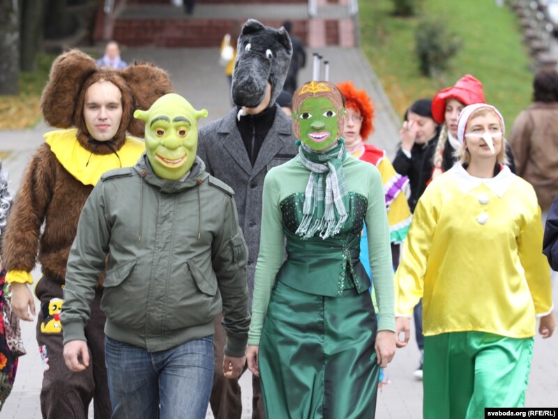 Грамадзскія актывісты ў строях казачных пэрсанажаў на чале са "Шрэкам ідусь у МЗС, каб нагадаць дыпляматам пра існаваньне артыкула 193.1