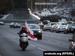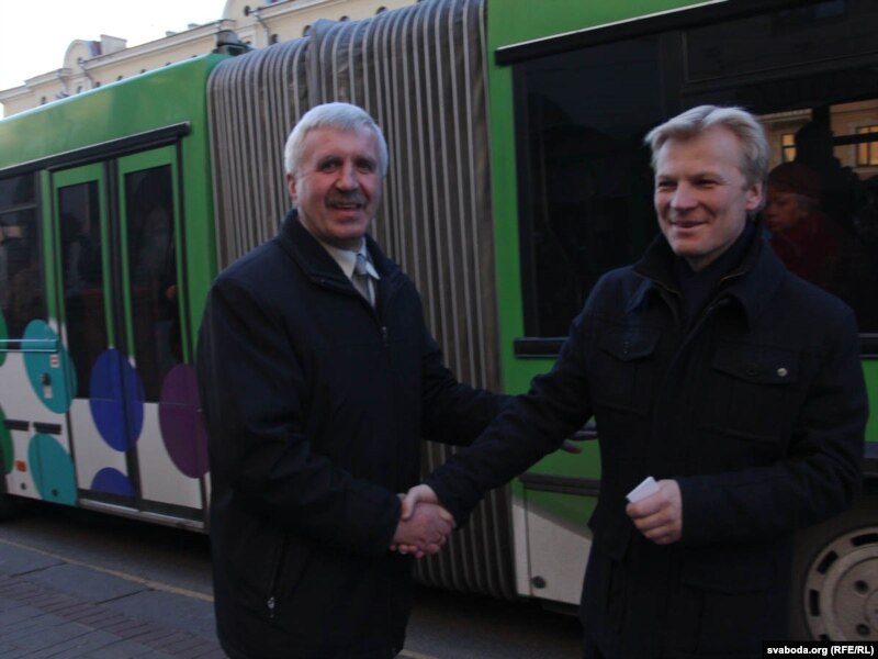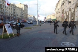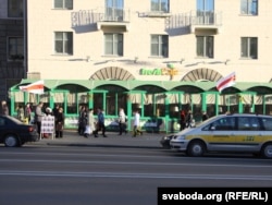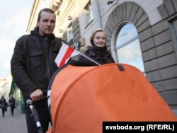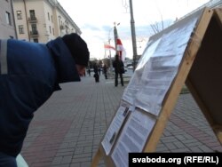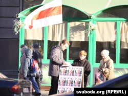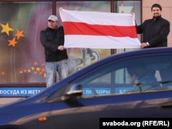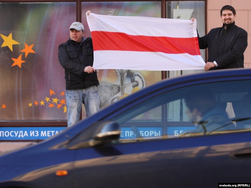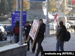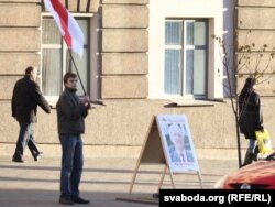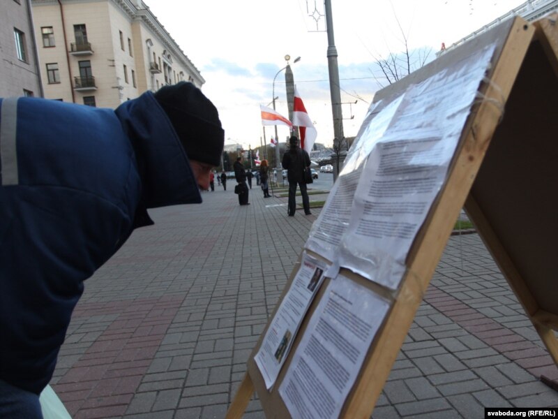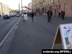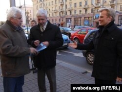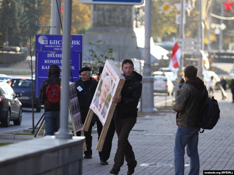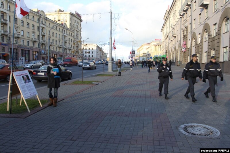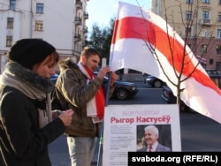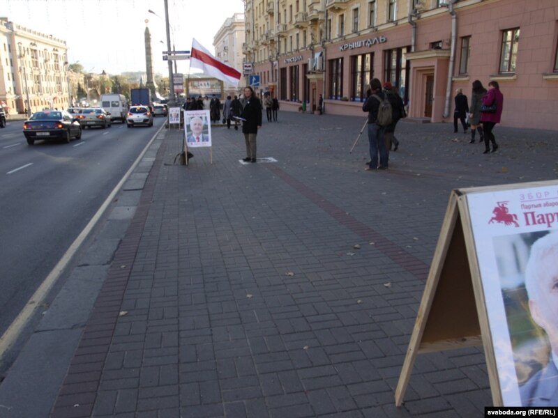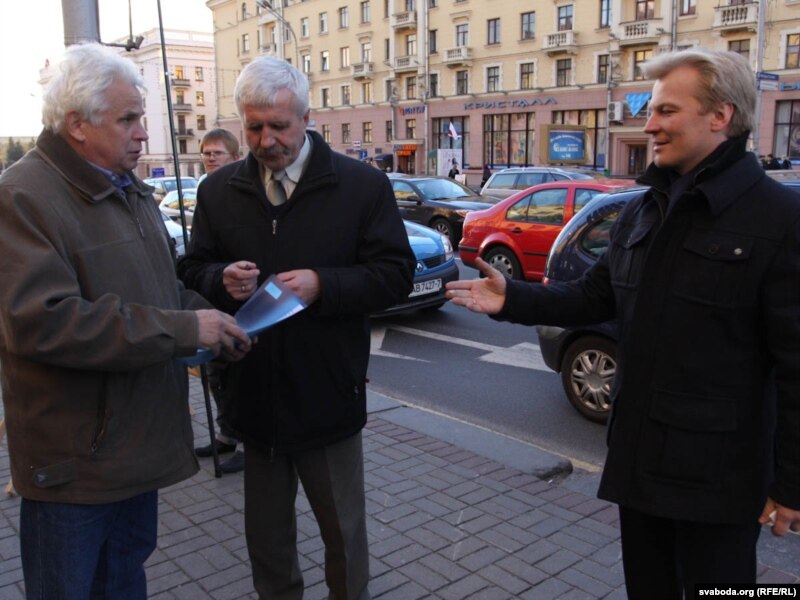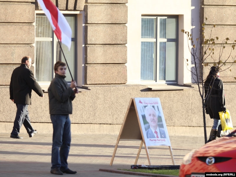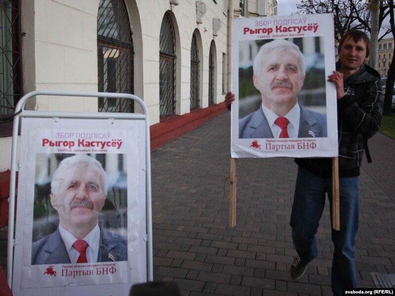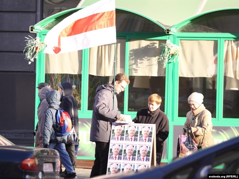 Каля трох дзясяткаў чалавек зь бел-чырвона-белымі сьцягамі пашыхтаваліся абапал дарогі на праспэкце Незалежнасьці ад плошчы Перамогі да скрыжаваньня з вуліцай Казлова. Каля стэндаў з партрэтамі Рыгора Кастусёва яны зьбіралі подпісы. Навошта абрана гэткая форма перадвыбарчай кампаніі, адзін з ініцыятараў акцыі Сяржук Семянюк патлумачыў наступным чынам: