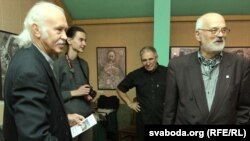 На фота: віншаваньне з выставай (Алесь Марачкін зьлева)