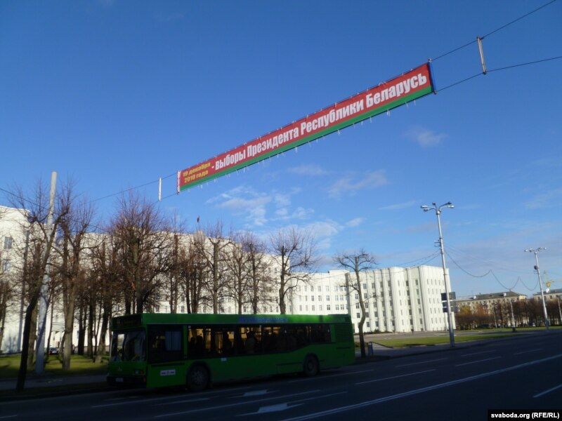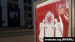 Увесь 2010 год чыноўнікі гарвыканкаму пражылі поруч з годам беларускай мовы. Агітацыйны банэр ля будынка гарвыканкаму.