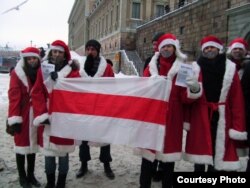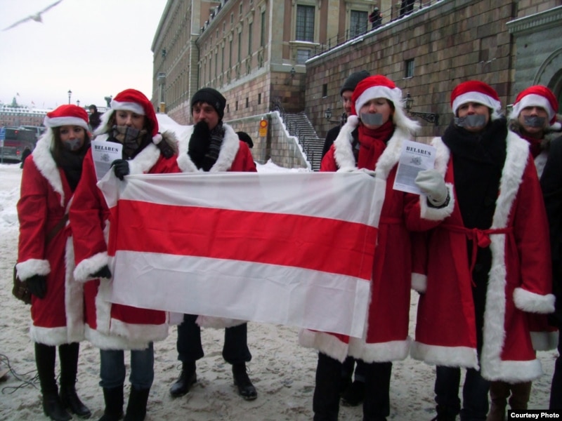Удзельнікі акцыі, апранутыя ў строі Дзеда Мароза, заляпілі сабе скотчам раты. Гэта мелася сымбалізаваць ціск на свабоду слова ў Беларусі.