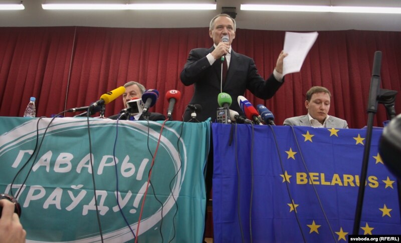 За дзень да асноўнага дня галасаваньня на выбарах прэзыдэнта Беларусі два апазыцыйныя кандыдаты Ўладзімер Някляеў і Андрэй Саньнікаў разам заявілі, што вольных выбараў у краіне няма і заклікалі суграмадзян 19 сьнежня ісьці на Кастрычніцкую плошчу Менска пратэставаць.