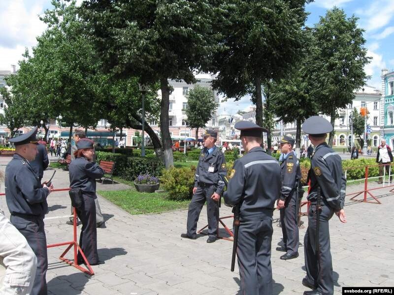 Супрацоўнікі міліцыі сур’ёзна рыхтаваліся да таго, што народу зьбярэцца нашмат больш: яшчэ ў 18:30 плошчу Перамогі абгарадзілі па пэрымэтры жалезнымі загарадкамі, а з чатырох бакоў усталявалі турнікеты з мэталашукальнікамі.