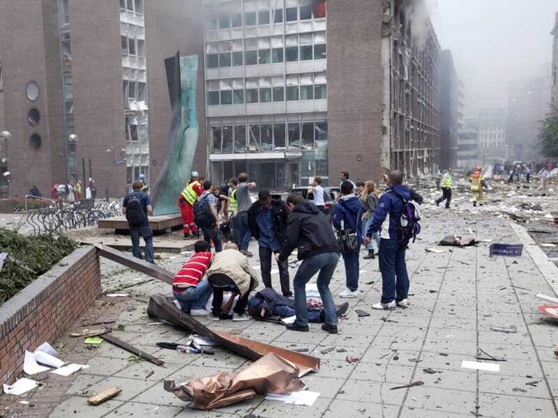 Раней у пятніцу адбыўся выбух каля комплексу урадавых будынкаў у цэнтры Осьлё, дзе разьмяшчаюцца канцылярыя прэм'ер-міністра, а таксама міністэрствы энэргетыкі, прамысловасьці і юстыцыі. Ахвярамі выбуху, паводле паліцыі, сталі сем чалавек, больш за 19 былі параненыя. Прэм'ер-міністар Нарвэгіі, лідэр Працоўнай партыі Енс Стoльтэнбэрг, і іншыя чыноўнікі не пацярпелі.