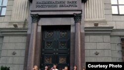 У Менску ў рамках кампаніі "Рэвалюцыя праз сацыяльную сетку" актывісты правялі пэрформанс ля галоўнага ўваходу ў Нацыянальны банк пад назовам "Нацбанк - банкрут!"