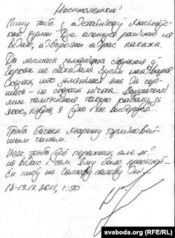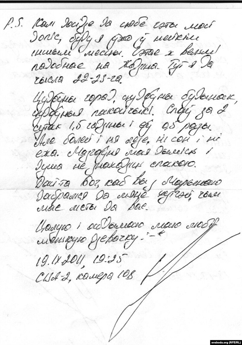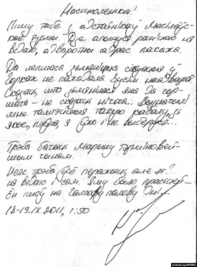 "Насьцюленька!Пішу табе з адстойнікаў магілёўскай турмы. Дзе апынуся раніцай, ня ведаю. Адваротны адрас пакажа.