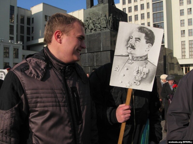 А 10-й раніцы да помніка свайму правадыру прыйшлі камуністы з праўладнай КПБ. Зь лёзунгамі і партрэтамі Сталіна. Прастаялі роўна гадзіну.