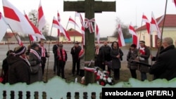 Да крыжа ўсклалі вянок зь бел-чырвона-белымі кветкамі, паставілі запаленыя зьнічкі.