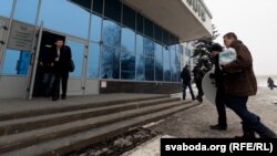 Прадстаўнік «Белсату» ў Беларусі Міхась Янчук на ганку будынка Беларускага тэлебачаньня, што на вуліцы Макаёнка, 9, выступіў з заявай: