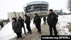 11.35 25 хвілінаў да пачатку акцыі. Людзей у цывільным заўважна паболела. Удзельнікаў як і раней няма. Пляцоўка перад кіратэатрам "Кастрычнік", агарожаная турнікетамі пустая.