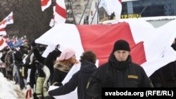 12.45 Дзяўчаты крычаць «Люблю Беларусь!» Ходнікі вельмі вузкія, не ачышчаныя ад сьнегу. Цяпер удзельнікі ідуць уздоўж друкарні — на іншы бок вуліцы калёну не пусьцілі міліцыяты.