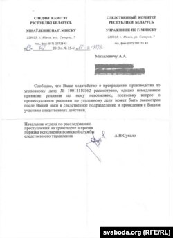 «Амаль два месяцы назад па рэкамэндацыі сваіх адвакатаў падаў хадайніцтва ў Сьледчы камітэт на спыненьне ў адносінах да мяне крымінальнай справы. Вось такі атрымаў адказ.