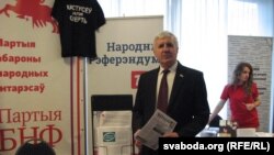 «Я тут прэзэнтую праграму Партыі БНФ, расказваю, хто мы такія і чым мы займаемся ў Беларусі. Таксама мы разам зь іншымі сябрамі Партыі БНФ прэзэнтуем нашыя кампаніі рознага часу — пачынаючы бягучай кампаніяй „Народны рэфэрэндум“ і сканчваючы больш даўняй кампаніяй, падчас якой мы рыхтавалі правядзеньне аўтарэфэрэндуму.