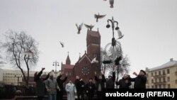 На плошчы Незалежнасьці яны выпусьцілі 11 галубоў у надзеі, што 11 цяперашніх палітвязьняў хутка выйдуць на волю.