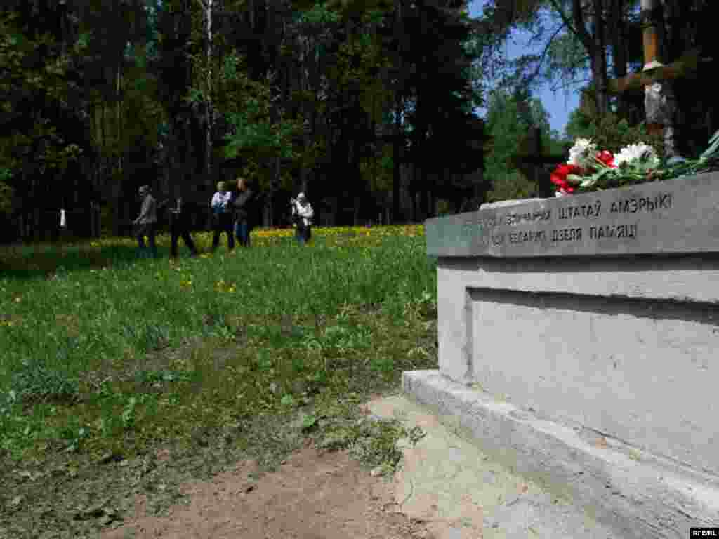 Прэзыдэнт Радыё Свабода Джэф Гедмін, карэспандэнт Свабоды Алесь Дашчынскі, дырэктар беларускай Свабоды Аляксандар Лукашук, карэспандэнтка Свабоды Ганна Соўсь і кіраўніца курапацкага мэмарыялу Мая Кляшторная ў Курапатах. Травень 2009 году.