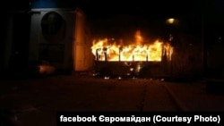 Невядомыя падпалілі аўтобус праваахоўнікаў, які выцягнулі зь міліцэйскага ачапленьня на вуліцы Грушэўскага ў Кіеве, кінуўшы ў яго пакет з запальнай сумесьсю.