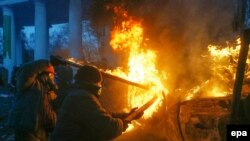Супрацьстаяньне мітынгоўцаў і міліцыі ў Кіеве працягваецца ўжо другі дзень. У адказ на сьвятла-шумавыя гранаты сілавікоў, майданаўцы «абстрэльваюць» іх піратэхнікай.