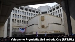 Каля крымскай Вярхоўнай рады таксама сабраліся на мітынг прыхільнікі ідэі далучэньня Крыму да Расеі.