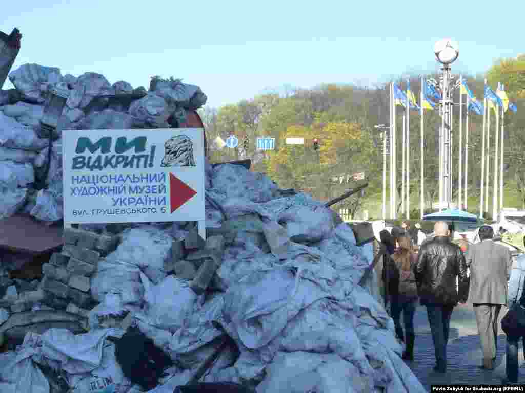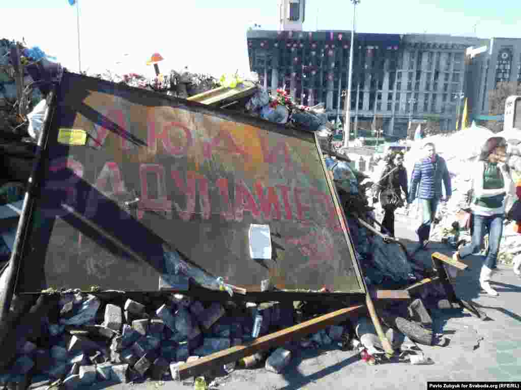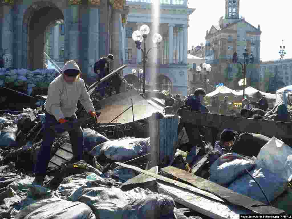 Гэтымі выходнымі у Кіеве адбылося прыбіраньне Майдану Незалежнасьці, а таксама дэмантаж часткі барыкадаў. Адчыненая для праезду і вуліца Грушэўскага, на якой засталіся дэкаратыўныя барыкады у гонар загіблых. На адной зь іх усталяваны партрэт Жызнеўскага і бел-чырвона-белы сьцяг. Фотагалерэя: Паўло Зуб'юк
