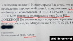 «Ніякіх георгіеўскіх стужак быць не павінна!» — гаворыцца ў паведамленьні.Другі сакратар ЦК БРСМ Андрэй Белякоў распавёў Свабодзе: