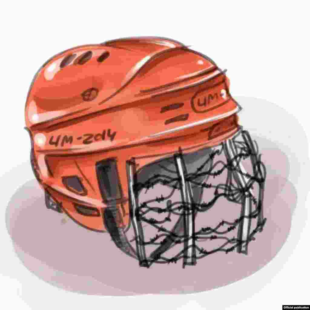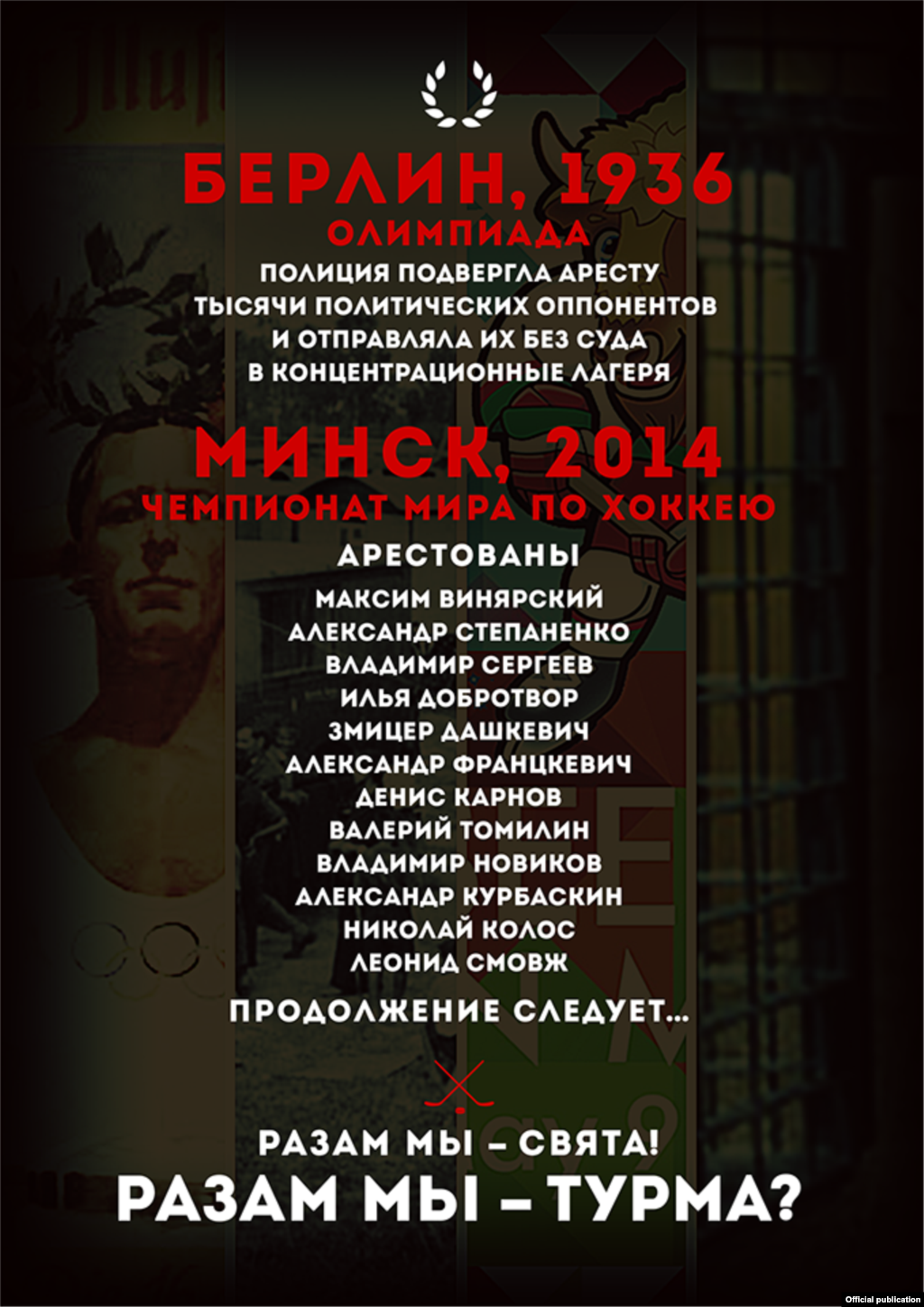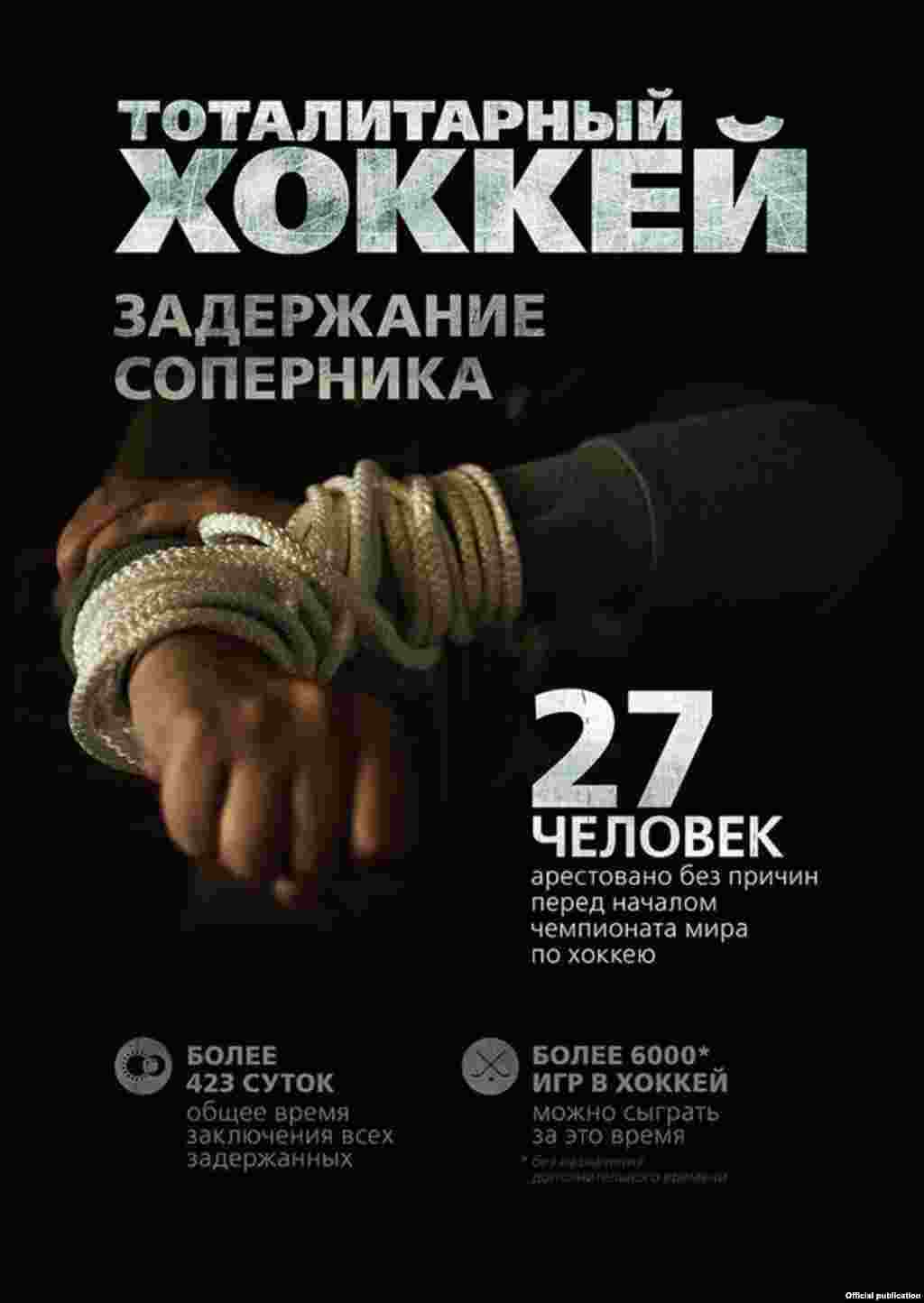 Таталітарны хакей. Плякаты пра палітвязьняў падчас чэмпіянату сьвету па хакеі ў Менску
