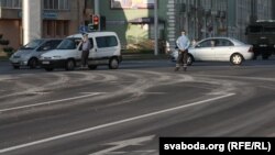 «Вось гэта змываюць і зьмятаюць, бо пойдзе пыл. Калі адкрыць рух па гэтым участку, то пойдзе пыл. А ў горадзе падняць пыл, потым мы тыдзень яго будзем прыбіраць. Дык мы яго адразу прыбіраем, каб яго не было. Інакш ён на дамах, на шкле асядзе, ён некуды ж дзенецца. А так мы яго змываем, зьмятаем у кучы і стараемся адразу сабраць, бо так зручней — адразу сабраць. Трэба ўсё прамесьці адразу. Гэта ў выніку атрымаецца таньней, чым потым перамятаць».