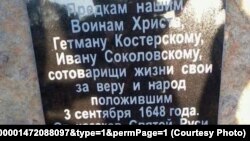 На дошцы ўзгадваюцца «Гетман Костерский, Иван Соколовский, сотоварищи жизни свои за веру и народ положившие 3 сентября 1648 года». І подпіс: «От казаков Святой Руси».