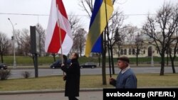 Удзельнікі шэсьця скандуюць «Слава Ўкраіне! Героям слава!», «Слава нацыі – сьмерць ворагам!». У калёне два ўкраінскія сьцягі. У некаторых удзельнікаў шэсьця побач зь бел-чырвона-белымі сьцяжкамі – украінскія сьцяжкі, зьнічкі і кветкі, крыжы.