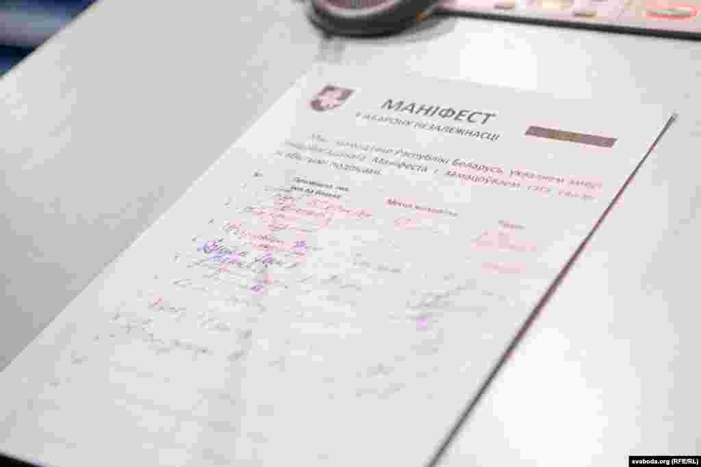 Першыя тры подпісы пад Маніфэстам паставілі Мечыслаў Грыб, Радзім Гарэцкі і вэтэран Другой сусьветнай вайны Фэлікс Шкірманкоў.