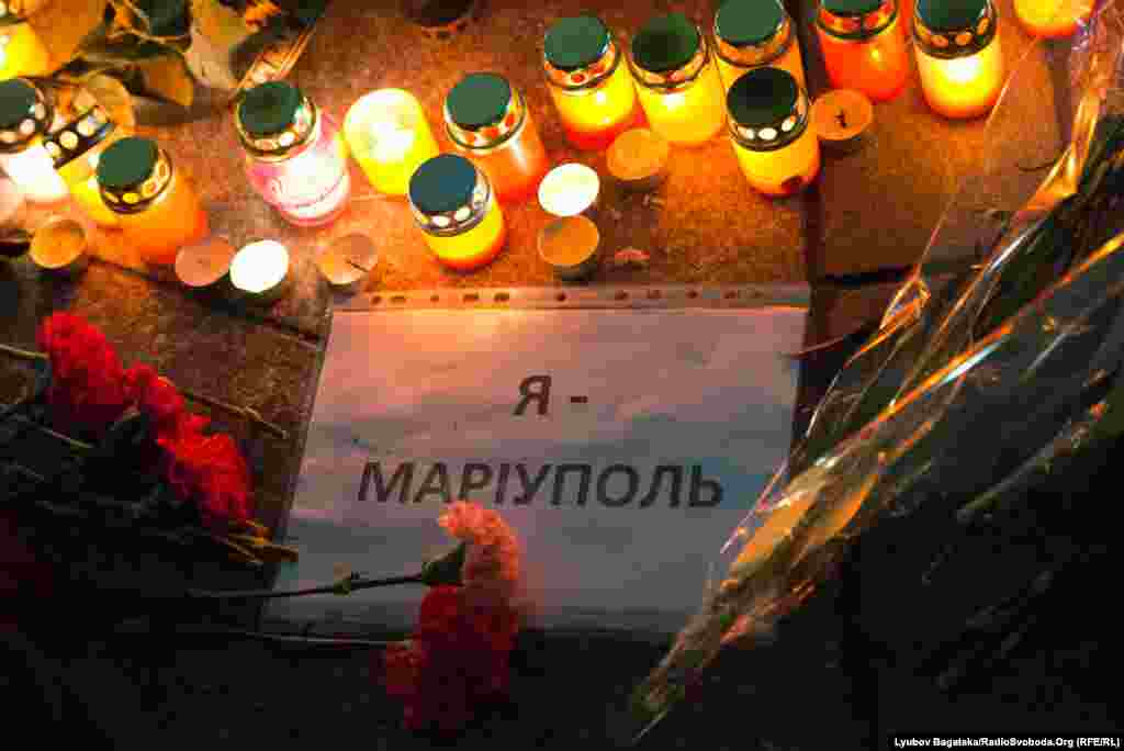 У Кіеве людзі на Майдан Незалежнасьці, каб ушанаваць памяць загінулых у суботу, 24 студзеня, ад абстрэлаў ў Марыюпалі.