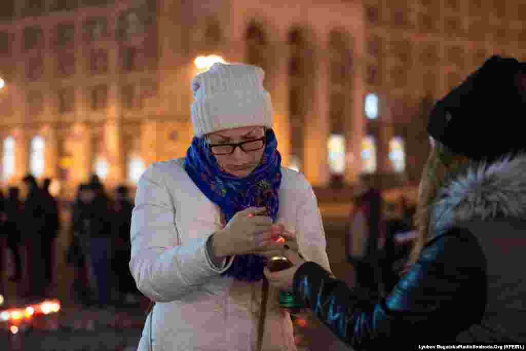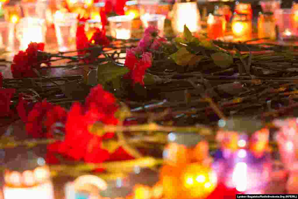 Кіяўляне пачалі прыходзіць на спантанны мітынг з 18:00 са сьвечкамі і кветкамі. І зараз на цэнтральнай плошчы сталіцы каля сотні неабыякавых грамадзян запальваюць лямпадкі па загінулых.