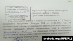 «Суд Ленінскага раёну г. Менску на падставе п. 7.2 дэкрэту прэзыдэнта Рэспублікі Беларусь № 18 ад 24.11.2006 г. „Аб дадатковых захадах дзяржаўнай абароны дзяцей у праблемных сем’ях“ накіроўвае копію пастановы суду ў адносінах да Беленькага Ю.А. для забесьпячэньня кантролю за становішчам дзяцей у сям’і і своечасовага прыняцьця захадаў па абароне іх інтарэсаў. Дадатак: копія пастановы», — гаворыцца ў дакумэнце.