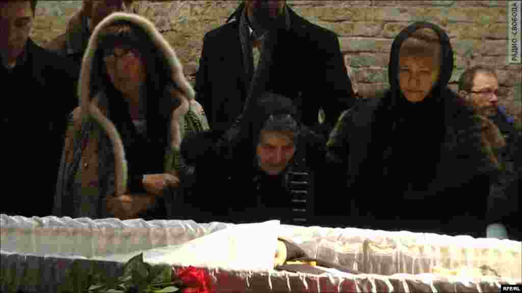 Маці Барыса Нямцова Дзіна Эйдман (зьлева) і ягоная дачка Дзіна (справа) ля труны нябожчыка.