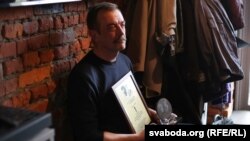 Сяргей Шапран з кнігай «Тры мяхі дзядзькі Рыгора, альбо сам-насам з Барадуліным».